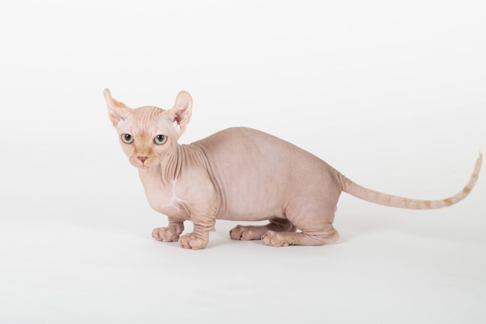 Este es otro cruce exótico que combina rasgos del Munchkin, Sphynx y American Curl. Es un gato con patas cortas, sin pelo y orejas curvadas.